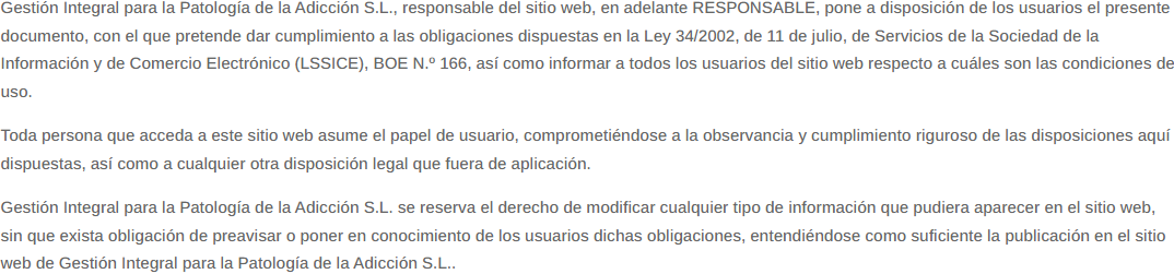El RESPONSABLE no se hace responsable de la información y contenidos almacenados, a título enunciativo pero no limitativo, en foros, chats, generadores de blogs, comentarios, redes sociales o cualquier otro medio que permita a terceros publicar contenidos de forma independiente en la página web del RESPONSABLE. Sin embargo, y en cumplimiento de lo dispuesto en los artículos 11 y 16 de la LSSICE, se pone a disposición de todos los usuarios, autoridades y fuerzas de seguridad, colaborando de forma activa en la retirada o, en su caso, bloqueo de todos aquellos contenidos que puedan afectar o contravenir la legislación nacional o internacional, los derechos de terceros o la moral y el orden público. En caso de que el usuario considere que existe en el sitio web algún contenido que pudiera ser susceptible de esta clasificación, se ruega lo notifique de forma inmediata al administrador del sitio web.